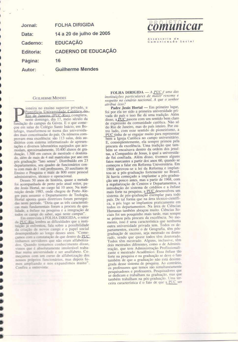 Entrevista com Padre Jesús Hortal no Caderno de Educação da Folha Dirigida de 14 a 20/07/2005 sobre os 50 anos da PUC-Rio na Gávea.