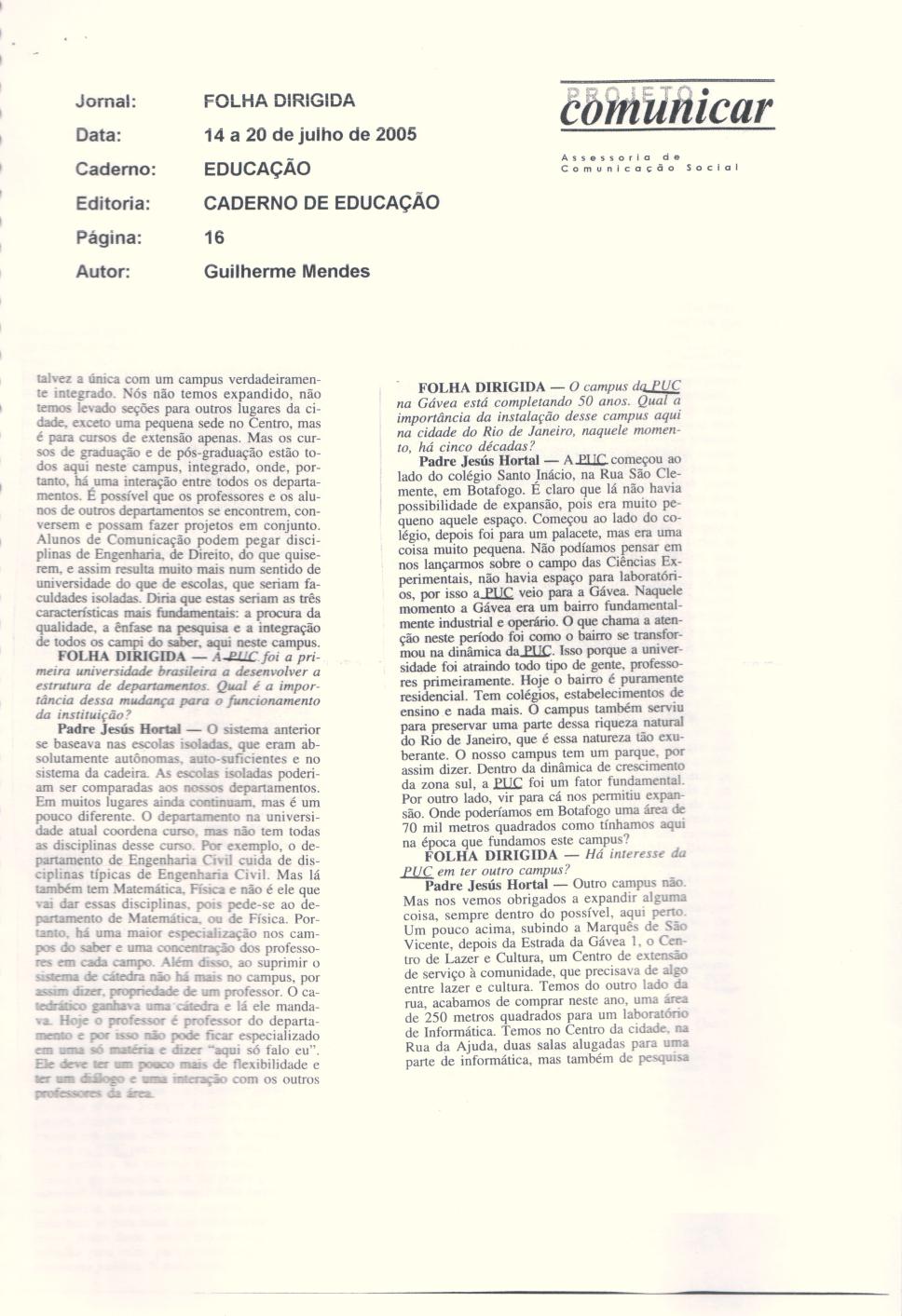 Continuação da entrevista com o Padre Jesús Hortal no Caderno de Educação da Folha Dirigida de 14 a 20/07/2005 sobre os 50 anos da PUC-Rio na Gávea.