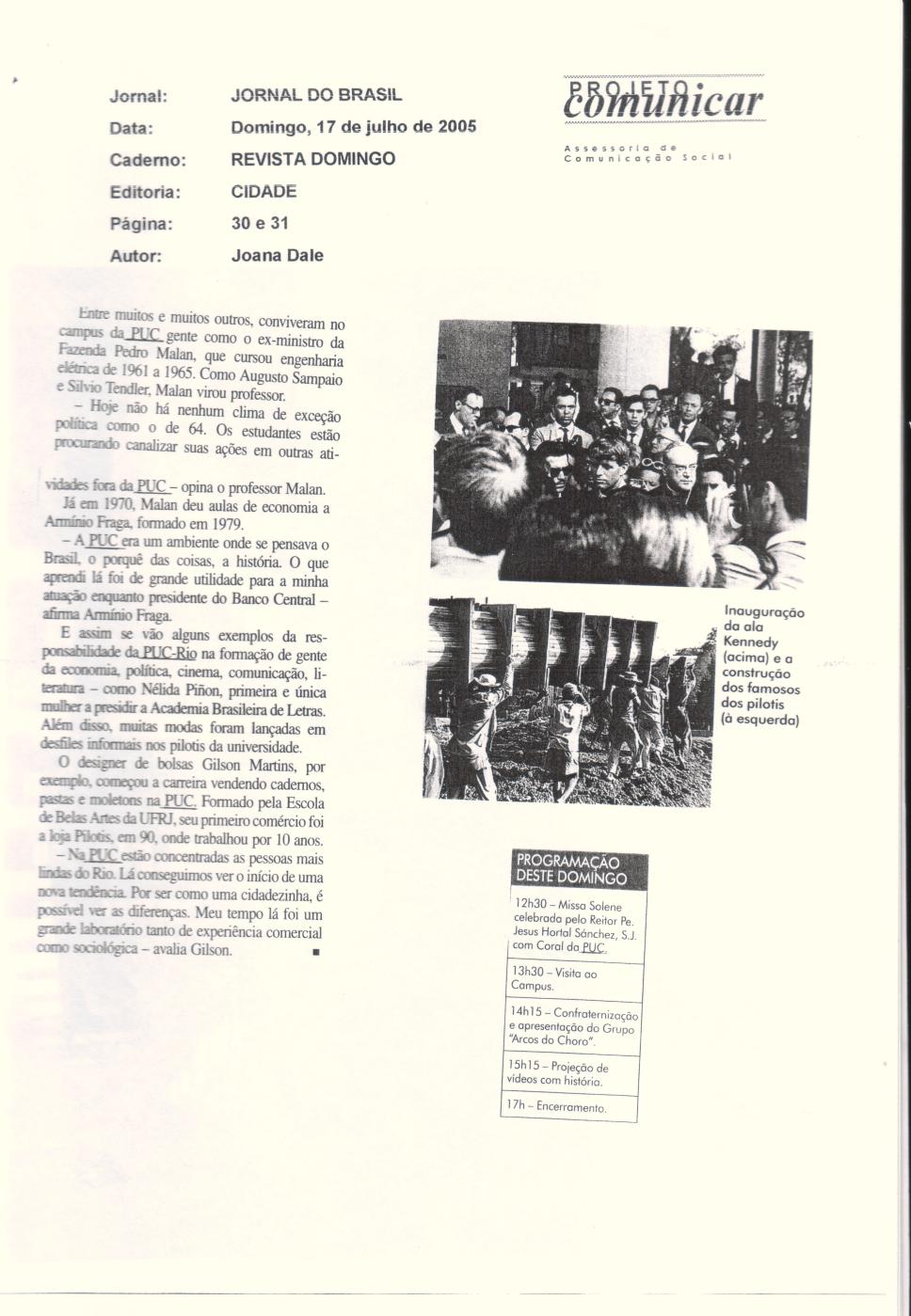 Continuação de reportagem na Revista de Domingo do Jornal do Brasil de 17/07/2005 sobre os 50 anos da PUC-Rio na Gávea.
