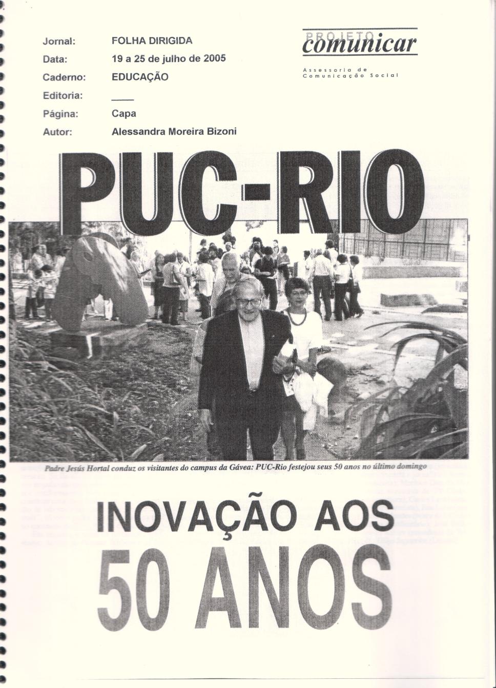 Reportagem do Caderno de Educação da Folha Dirigida de 19 a 25/07/2005 sobre a PUC-Rio - Inovação aos 50 anos. Foto na frente da Igraja do Sagrado Coração de Jesus.