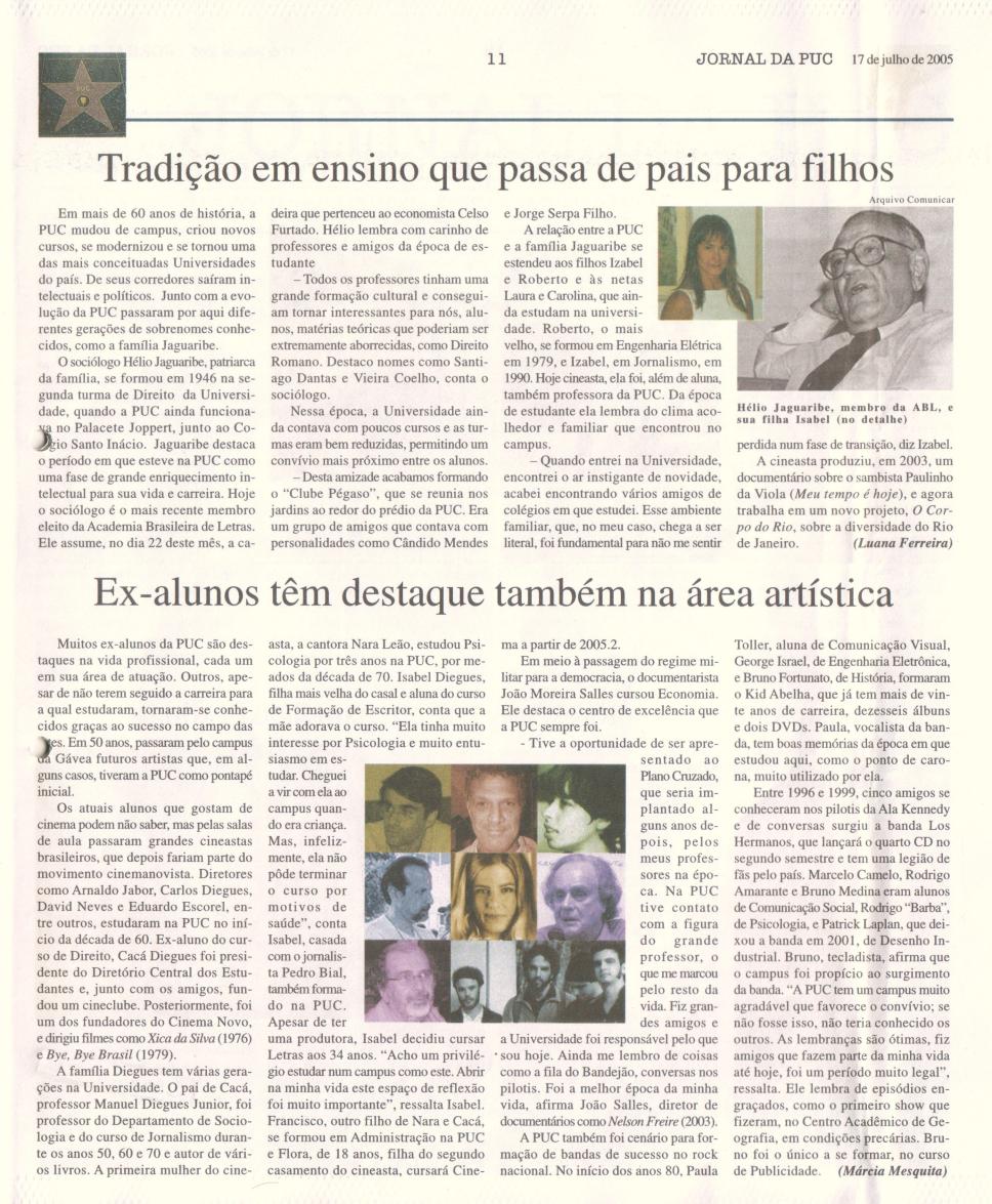 Jornal da PUC - 50 anos campus Gávea . P.11 - "Tradição em ensino que passa de pais para filhos"; "Ex-alunos têm destaque também na área artística". Com fotos.