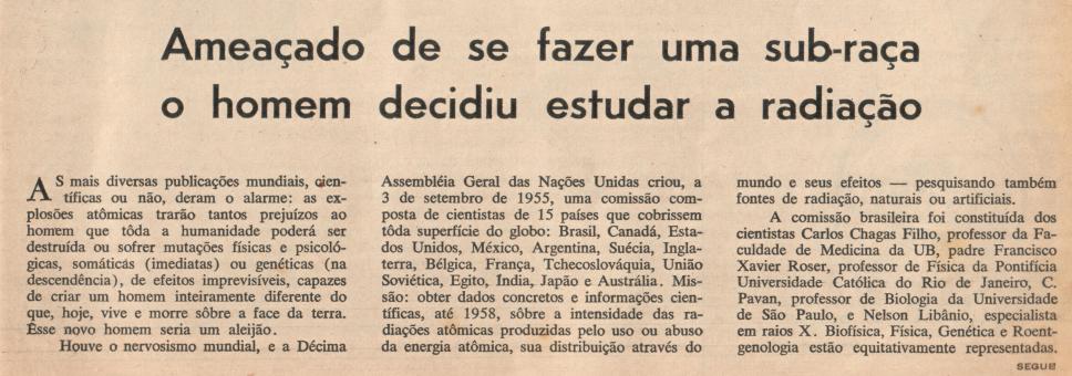 Revista Manchete no. 335: p.21 - "Ameaçado de se fazer uma sub-raça o homem decidiu estudar a radiação".