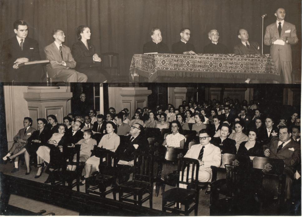 Posse da primeira Diretoria da Associação dos Antigos Alunos da Pontifícia Universidade Católica do Rio de Janeiro. Montagem com foto da mesa com autoridades e foto da plateia.
