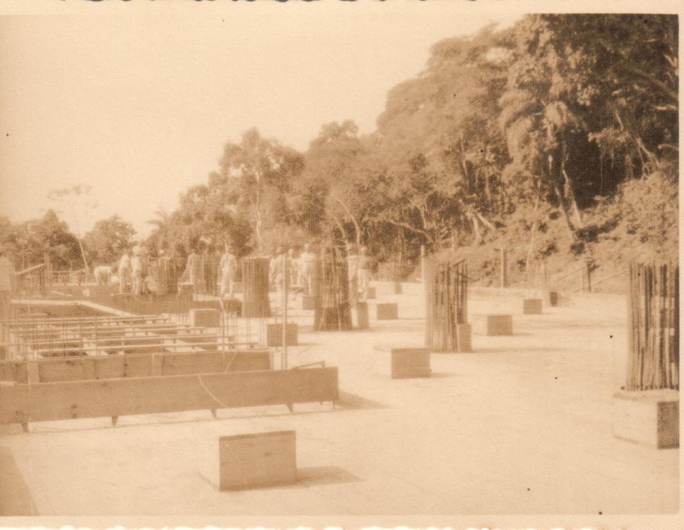 Obras do Edifício Central, posteriormente Cardeal Leme. Operários no teto do prédio, com vergalhões à vista.
