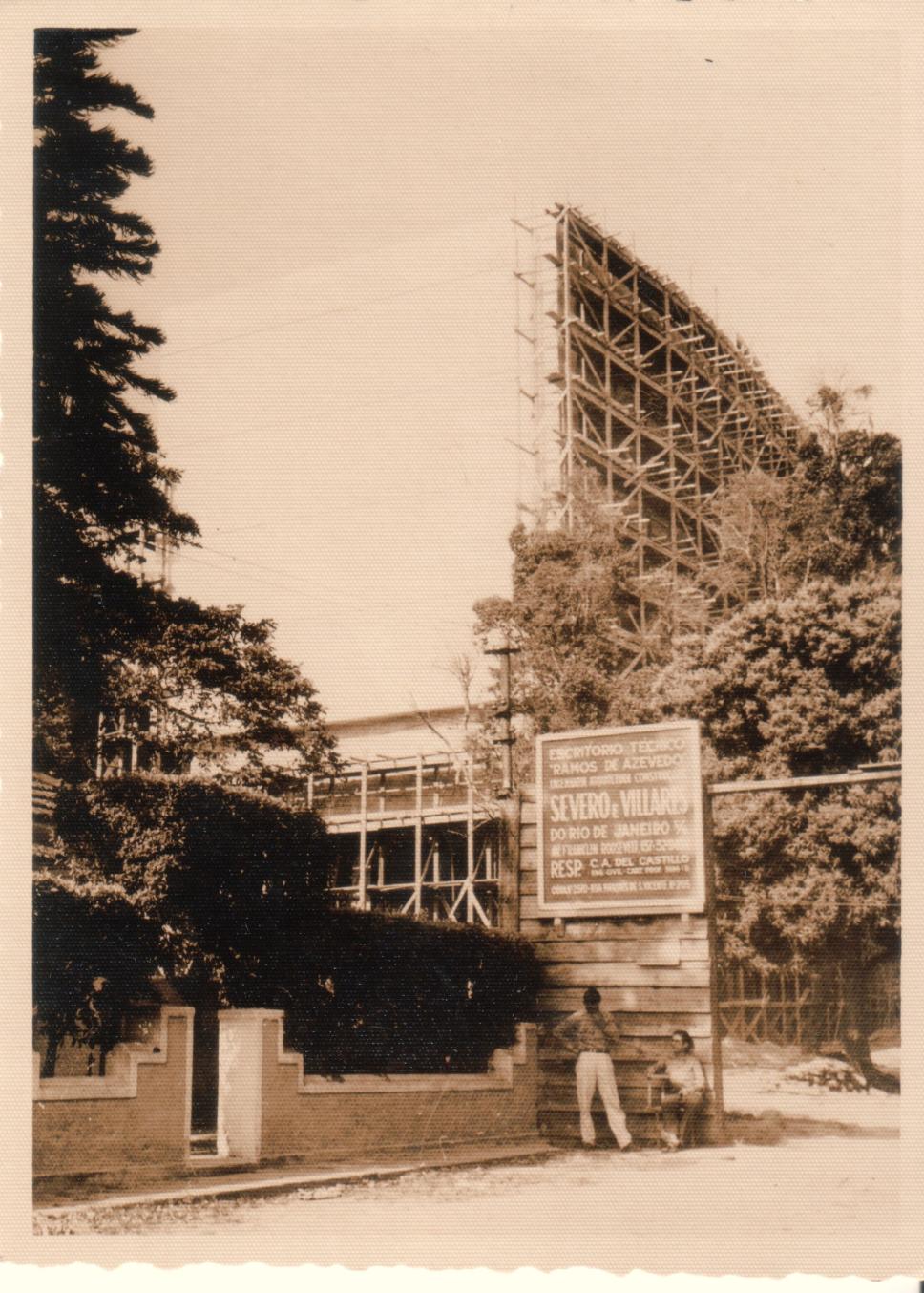 Obras do Edifício Central, depois Cardeal Leme. Vista a partir das frente de uma das casas remanescentes da vila que havia nos terrenos da PUC-Rio. Placa da construtora Severo e Villares, cujo engenheiro responsável era o prof. Carlos Alberto del Castillo. Dois homens perto do que seria o portão.