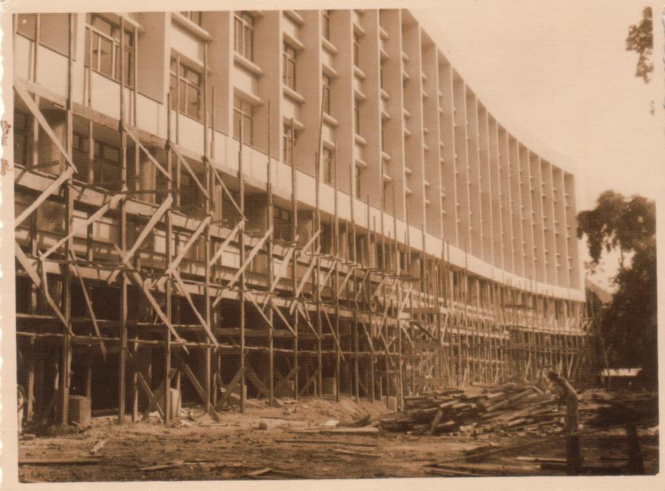 Construção do Edifício Central, depois Cardeal Leme. Vista da parte dos fundos, junto ao morro. Vê-se um operário e muita madeira utilizada na obra.