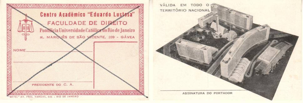 Carteira do Centro Acadêmico Eduardo Lustosa - frente, e verso com maquete da PUC-Rio.