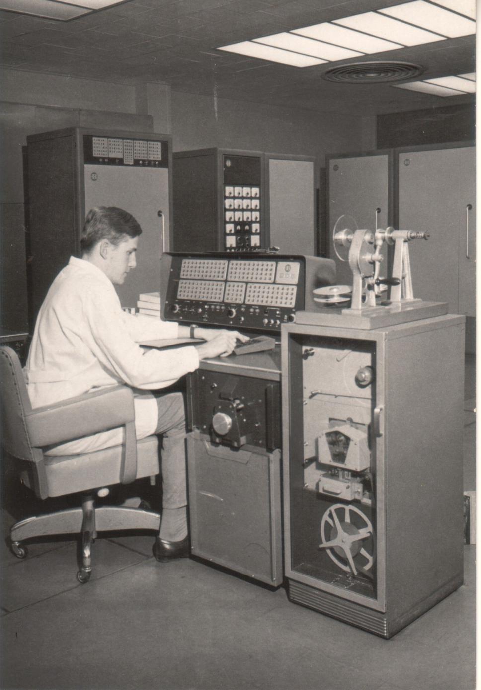 Técnico opera computador Burroughs B205.