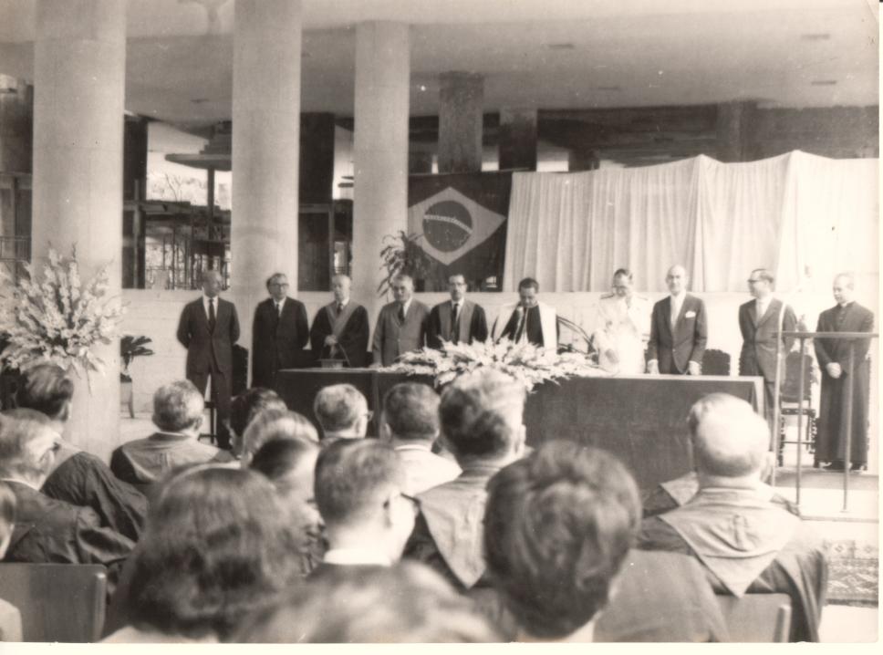 O reitor pe. Laércio Dias de Moura S.J. ao microfone nas comemorações do Jubileu de Prata da PUC-Rio. Na ocasião, com a presença do Embaixador da Alemanha Ocidental, foi inaugurado o prédio da Biblioteca Central e as novas instalações da Reitoria, ainda em obras, e houve a entrega das medalhas Cardeal Leme aos professores e o descerramento das placas aos benfeitores.