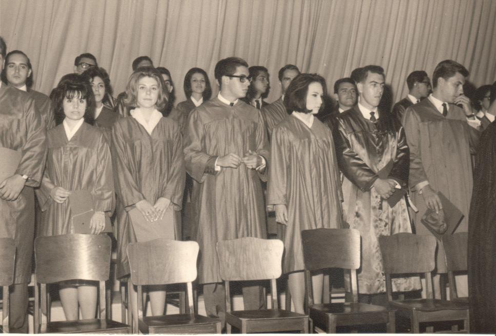 Alunos vestidos com becas em cerimônia de formatura, curso não identificado.