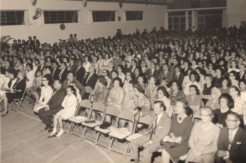 Plateia em solenidade no Ginásio de Esportes. Há a indicação de que seja uma cerimônia de formatura.