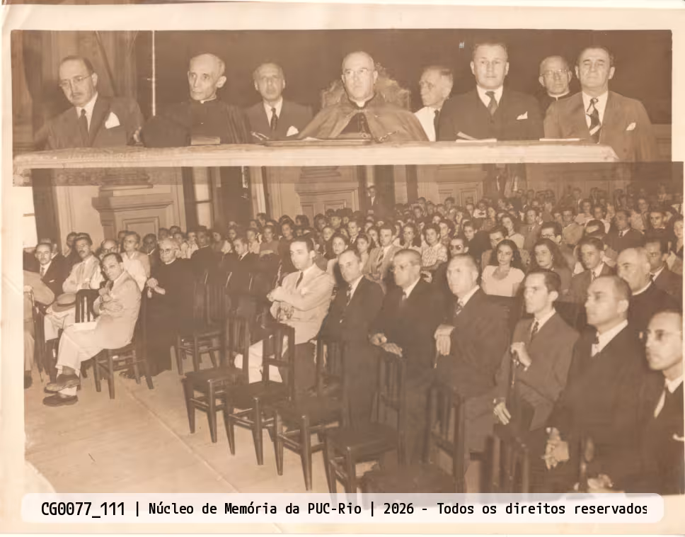 Instalação dos cursos da Universidade Católica no auditório do Colégio Santo Inácio. Montagem com foto da mesa de autoridades e da plateia.