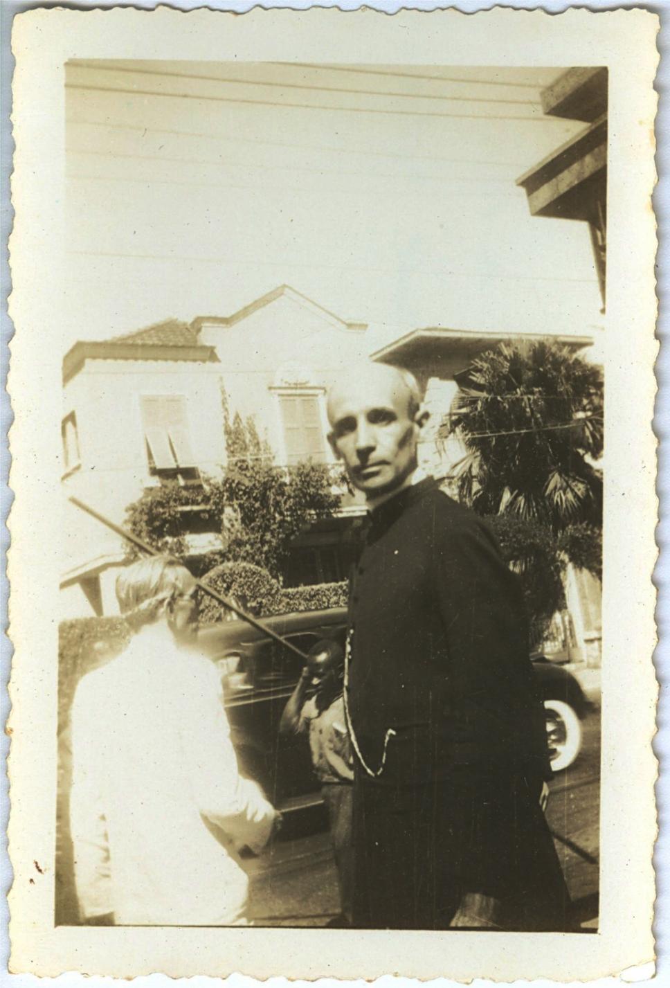 Padre Franca no portão do Colégio Santo Inácio, na rua São Clemente.