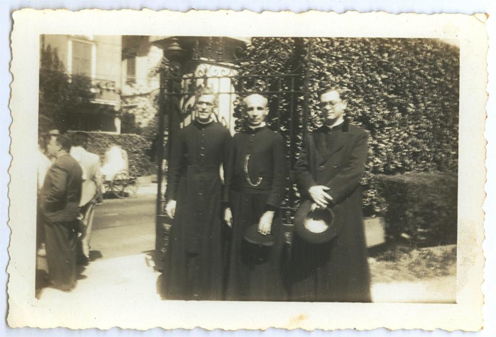 Padre Franca e dois outros padres, provavelmente um deles o Pe. Clóvis, no portão do Colégio Santo Inácio.