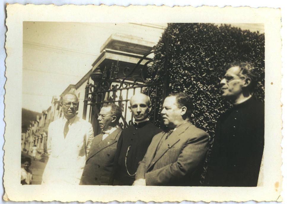 Padre Franca no portão do Colégio Santo Inácio, ladeado por outros professores.