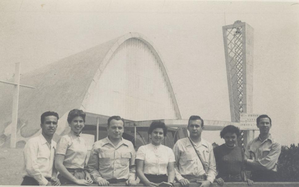 Excursão de alunos (homens e mulheres) dos cursos de Geografia e História da Faculdade de Filosofia em viagem a Minas Gerais. Em Belo Horizonte, em frente à igreja da Pampulha.