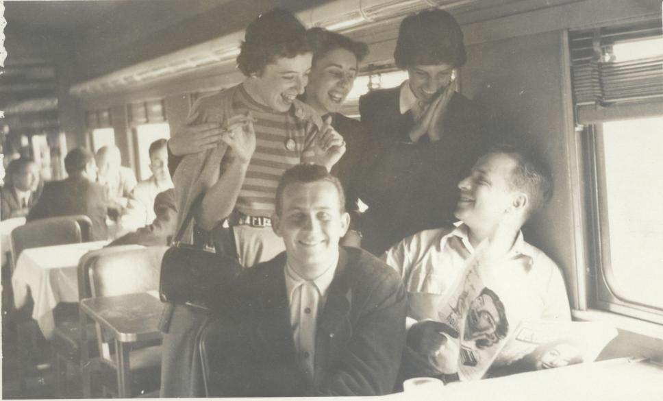Excursão de alunos (homens e mulheres) dos cursos de Geografia e História da Faculdade de Filosofia em viagem a Minas Gerais. Dentro de um trem.