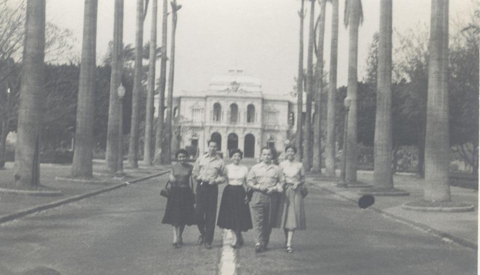 Excursão de alunos (homens e mulheres) dos cursos de Geografia e História da Faculdade de Filosofia em viagem a Minas Gerais. Em Belo Horizonte, em frente ao Palácio do Governo.