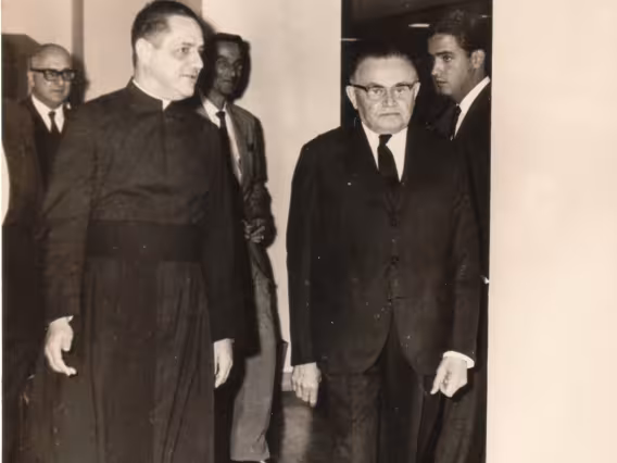 cg0078_037 | 19/10/1966 | O Reitor Pe. Laércio S.J. ao lado do Presidente Castelo Branco em visita à Biblioteca Central. |