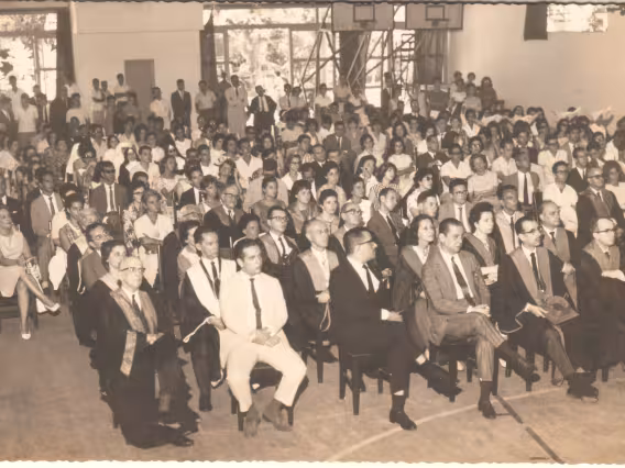 cg0078_058 | 1960 | Formandos e convidados participando de Cerimônia de Colação de Grau |