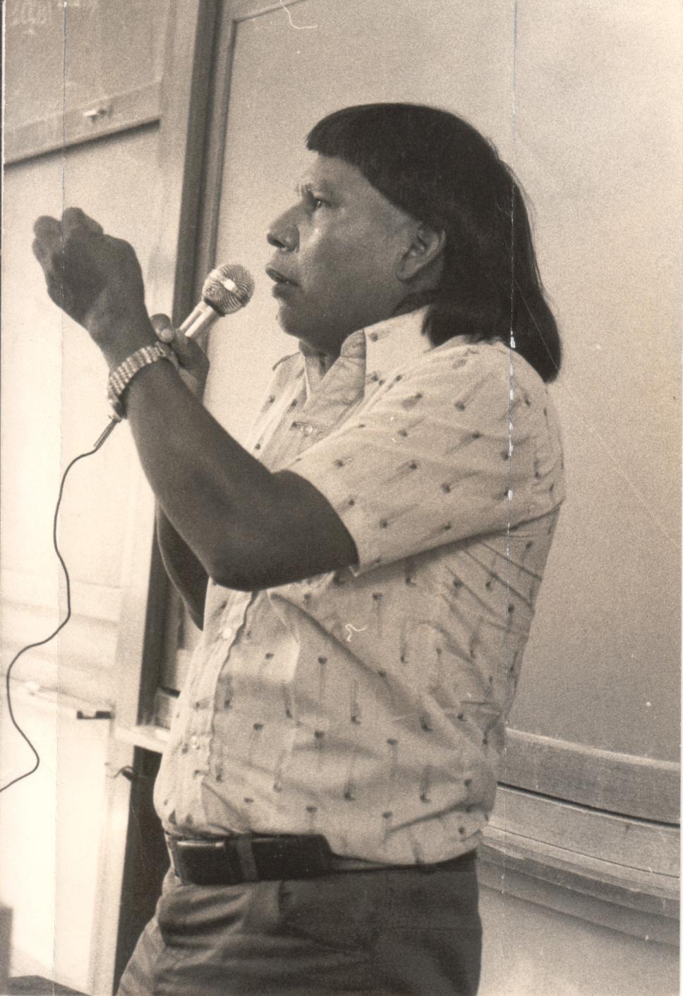 Ex-Cacique Xavante, Mário Juruna, discursa no Auditório AQ-5 para a comunidade da PUC-Rio. Ele gravava com um gravador cassete todas as suas palestras, entrevista e encontros. Sempre comentava que o "homem branco mudava muito de palavra".