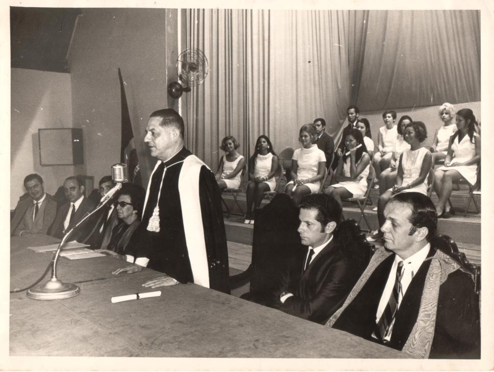 Discurso do Reitor Padre Laércio Dias de Moura S.J. durante a formatura da primeira turma do curso de Jornalismo da PUC-Rio que se formou em separado à Faculdade de Filosofia, após a Reforma Universitária que criou os departamentos, no caso, o Departamento de Comunicação Social.