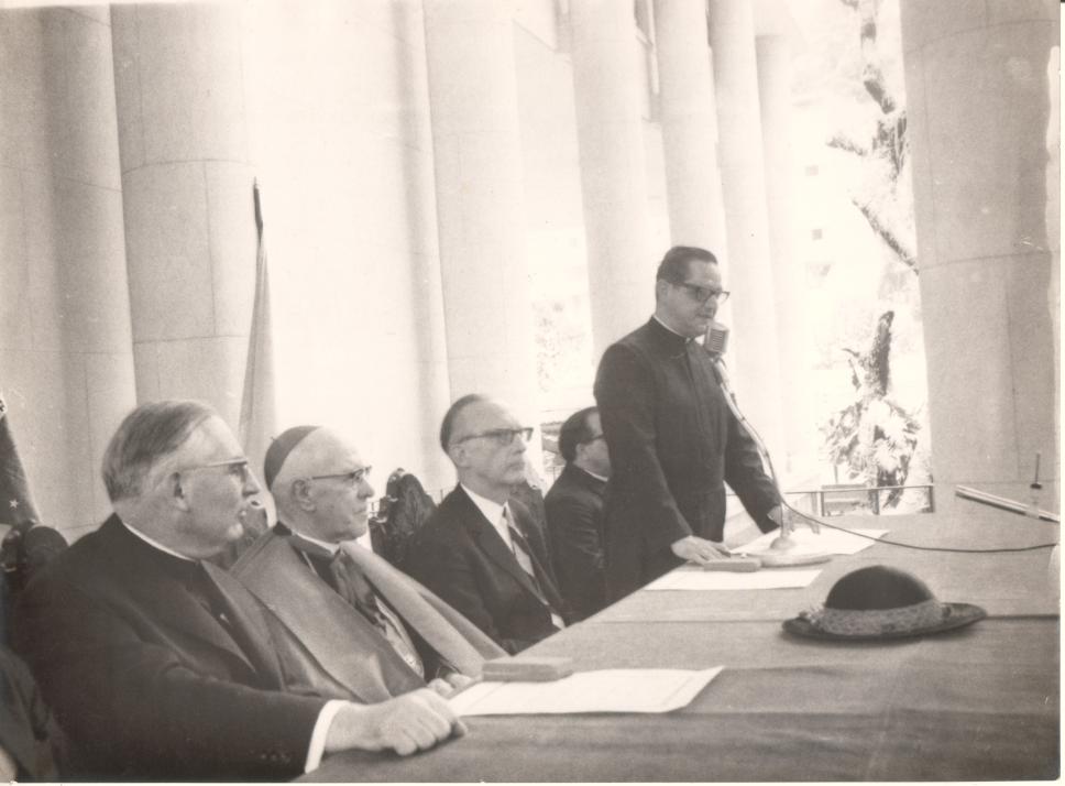O Reitor Pe. Laércio Dias de Moura S.J. discursa no evento de dedicação do Edifício da Amizade. Presentes, à mesa de autoridades, o Prelado Papal Pe. Gottfried Dossing, que representou o Cardeal Frings, e o Embaixador da Alemanha, Erhenfried von Holleben.