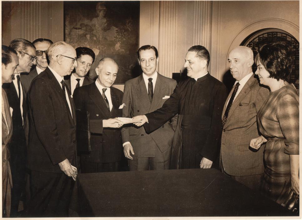 O reitor Pe. Laércio Dias de Moura S.J. recebe o cheque referente ao prêmio do 2º Sweepstake. Possivelmente na sede do Jockey Club Brasileiro.