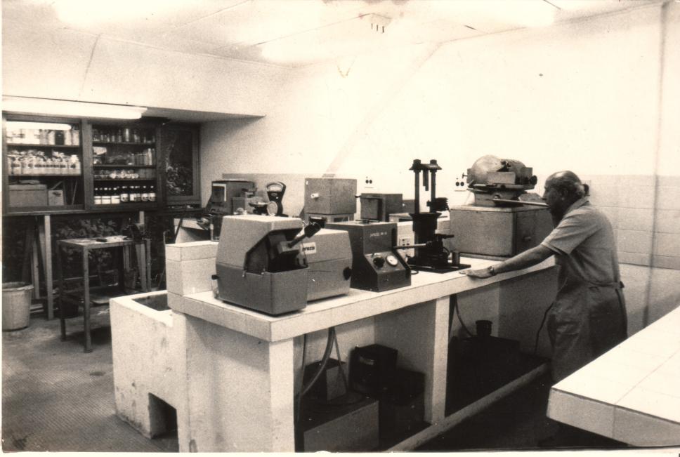 Bancadas e armário com material e equipamento do Laboratório de Metalografia e Tratamentos Térmicos do ITUC. Os materiais e ferrosos e concretos empregados na Ponte Rio-Niterói foram analisados neste laboratório.