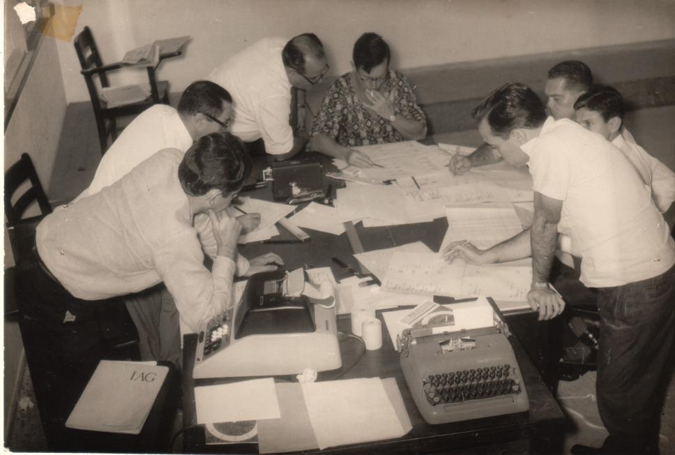 Grupo trabalha em projeto, utilizando documentos, planilhas, apontador de lápis, máquinas de calcular e de escrever. No canto esquerdo uma apostila do IAG.