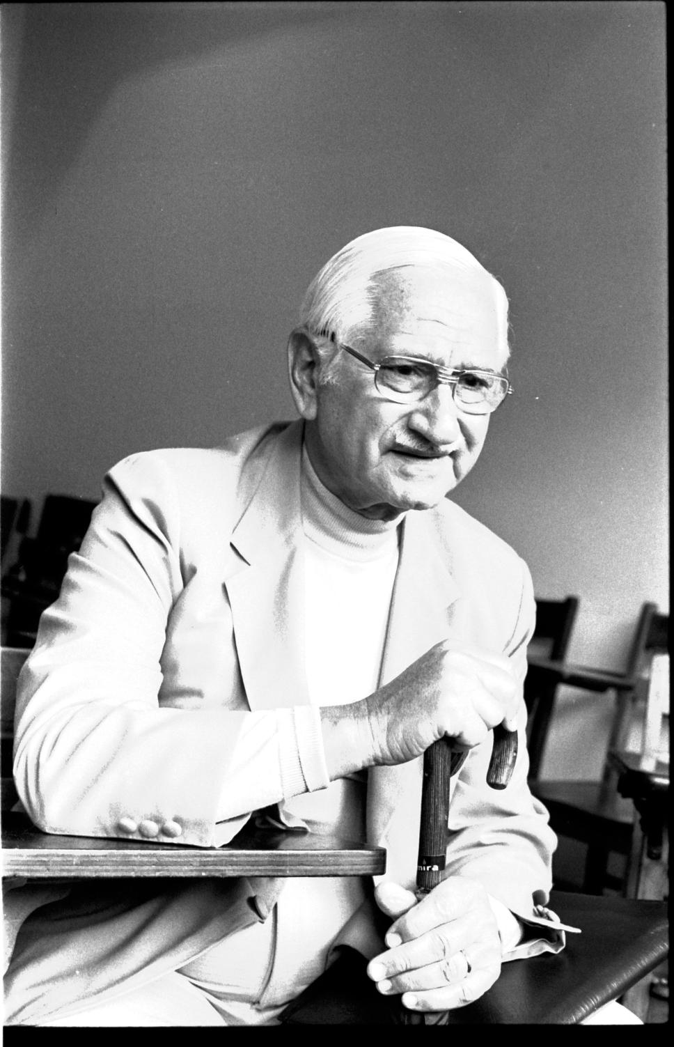 O cientista Albert Sabin concede entrevista para a Assessoria de Imprensa da Vice-reitoria de Desenvolvimento da PUC-Rio. Na ocasião, Sabin era aluno do curso de Português para Estrangeiros da Universidade.