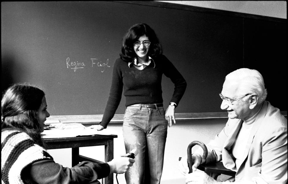 O cientista Albert Sabin frequentou durante um semestre o curso de Português para Estrangeiro oferecido na PUC-Rio pelo Departamento de Letras. No intervalo de uma das aulas foi realizada esta entrevista com a participação da profa. na tradução.
