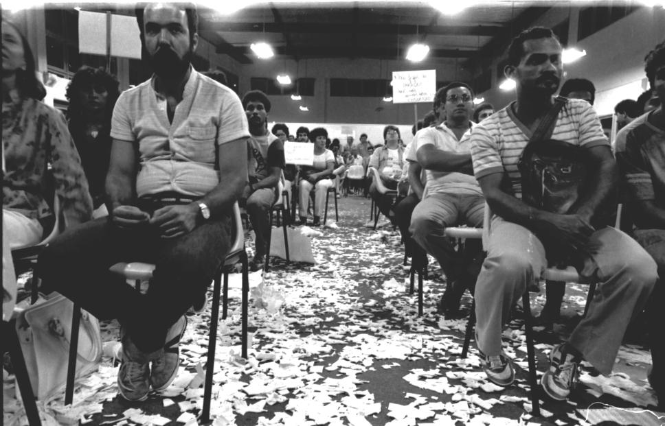 Assembleia de greve dos funcionários da PUC-Rio, com manifestantes empunhando cartazes. Papéis picados no chão. A greve chegou a ser decretada, mas negociações em dias posteriores levaram a um acordo e a greve foi cancelada.
