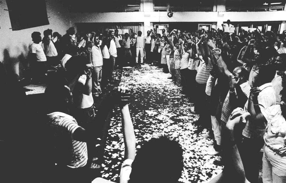 Assembleia de greve dos funcionários da PUC. Momento de comemoração, funcionários de mãos dadas e braços elevados. Papéis no chão. A greve chegou a ser decretada, mas negociações em dias posteriores levaram a um acordo e a greve foi cancelada.