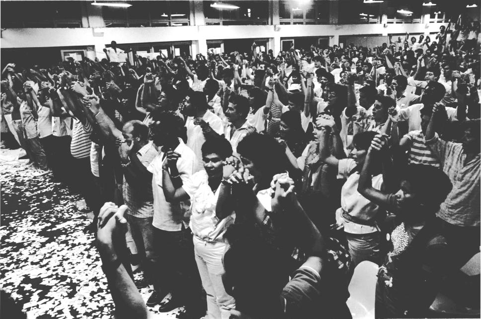 Assembleia de greve dos funcionários da PUC. Momento de comemoração, funcionários de mãos dadas e braços elevados. Papéis no chão. A greve chegou a ser decretada, mas negociações em dias posteriores levaram a um acordo e a greve foi cancelada.