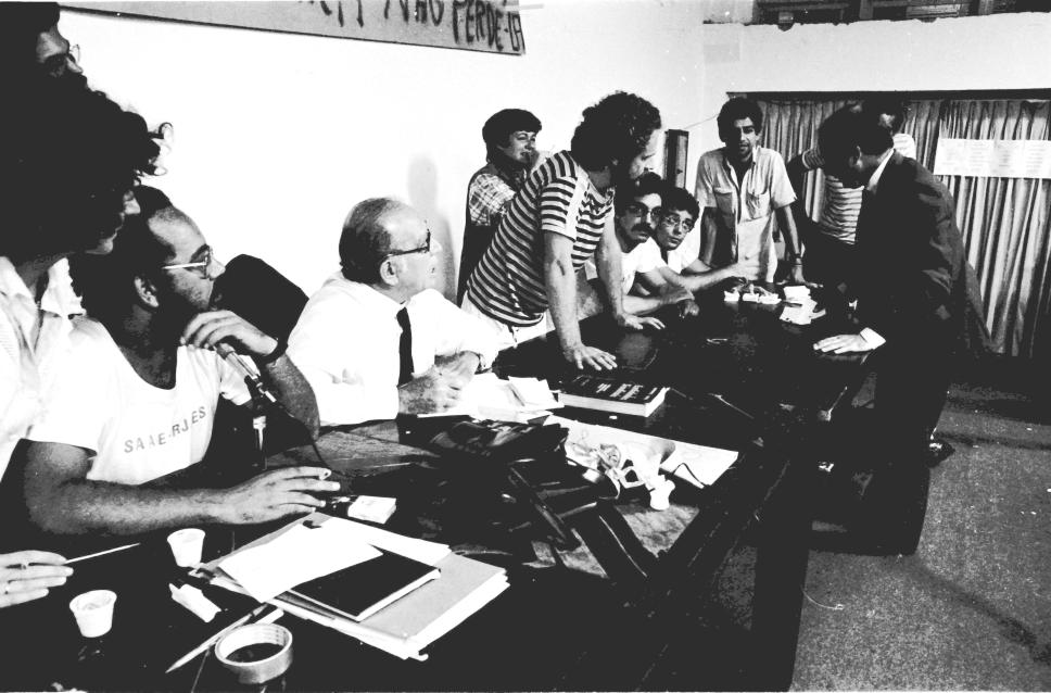 Mesa com dirigentes e negociadores em assembleia de greve dos funcionários da PUC. A greve chegou a ser decretada, mas negociações em dias posteriores levaram a um acordo e a greve foi cancelada.