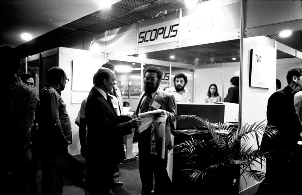Visita do Reitor pe. Mac Dowell S.J. aos stands do XIII Congresso Nacional de Processamento de Dados. A PUC-Rio tinha um stand no qual foram exibidos os produtos dos programas de pesquisa do LED - Laboratório de Eletrônica Digital, e do LESC - Laboratório de Sistemas de Computação.