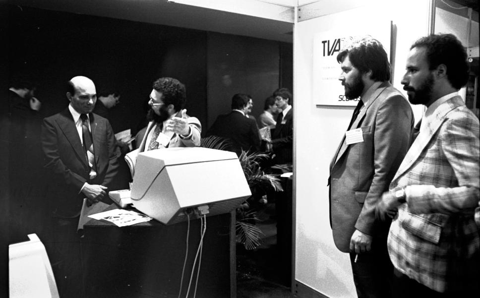 Visita do Reitor pe. Mac Dowell S.J. ao stand da PUC-Rio no XIII Congresso Nacional de Processamento de Dados. Nele foram exibidos os produtos dos programas de pesquisa do LED - Laboratório de Eletrônica Digital, e do LESC - Laboratório de Sistemas de Computação.