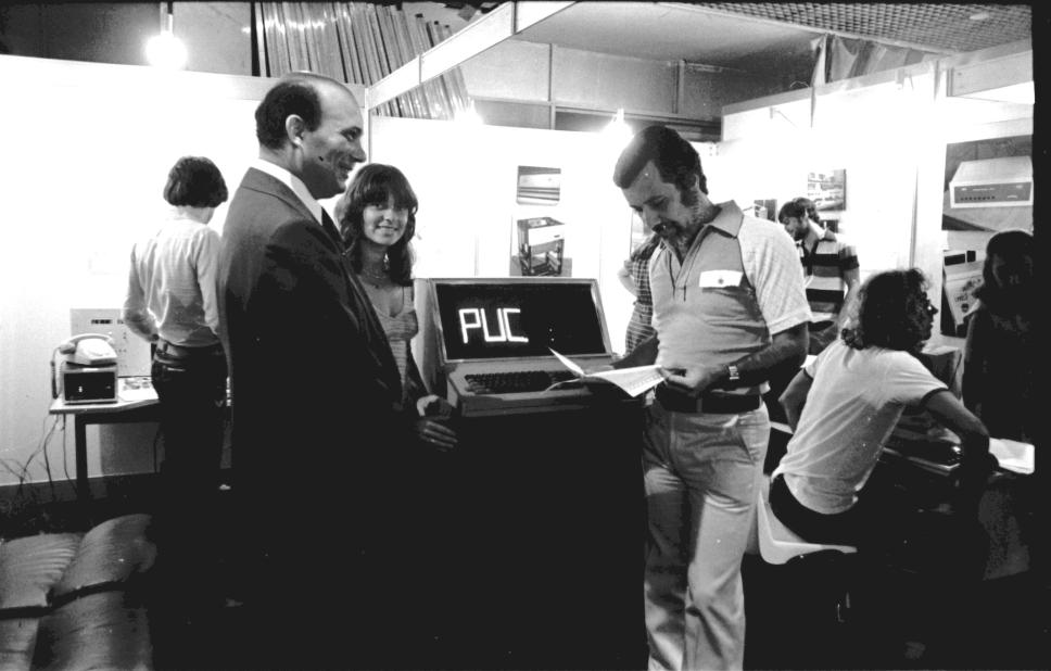 Stand da PUC-Rio no XIII Congresso Nacional de Processamento de Dados. Nele foram exibidos os produtos dos programas de pesquisa do LED - Laboratório de Eletrônica Digital, e do LESC - Laboratório de Sistemas de Computação.