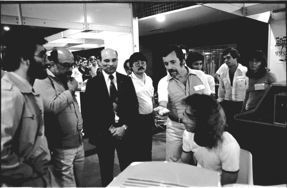 Visita do Reitor pe. Mac Dowell S.J. ao stand da PUC-Rio no XIII Congresso Nacional de Processamento de Dados. Nele foram exibidos os produtos dos programas de pesquisa do LED - Laboratório de Eletrônica Digital, e do LESC - Laboratório de Sistemas de Computação.