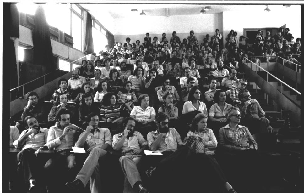 Reunião de professores com o Reitor Pe. João Mac Dowell S.J. em auditório do Instituto de Química. 1979.