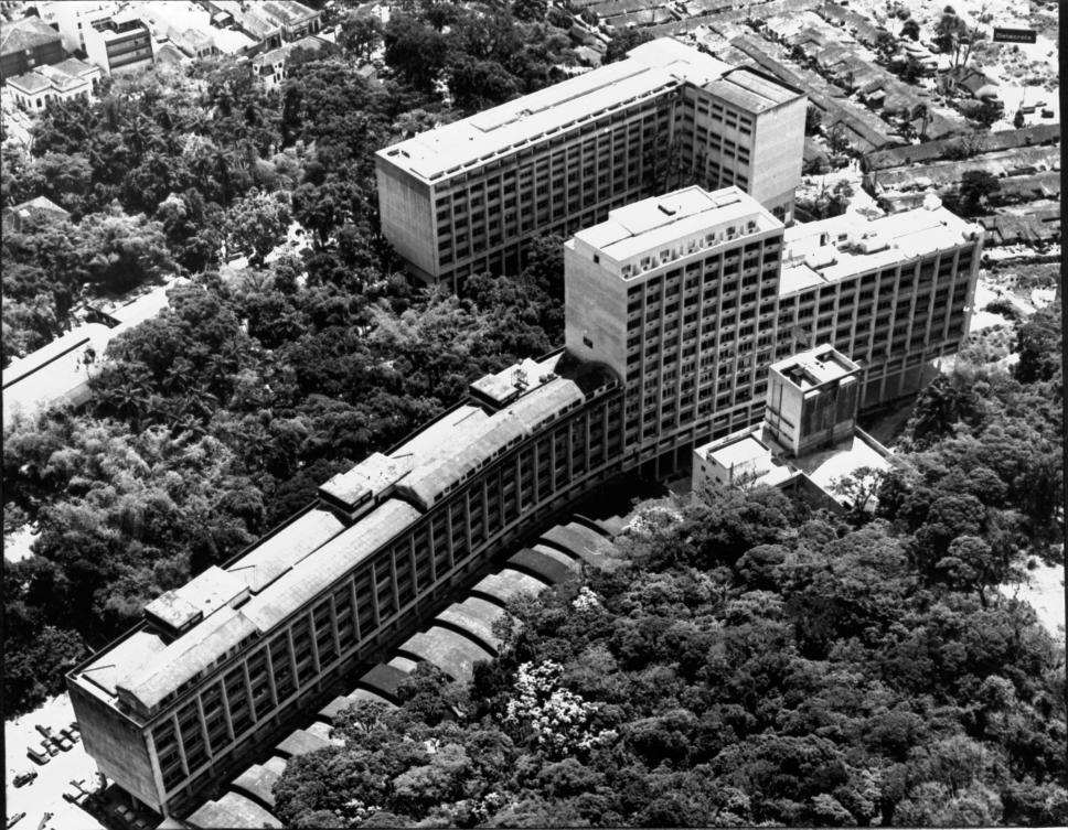 Reprodução de uma foto aérea da PUC-Rio. Vista aérea do campus Gávea, com o ITUC, o laboratório Van de Graaff, o Edifício Cardeal Leme, o antigo ginásio esportivo, o Edifício da Amizade e ao fundo, à direita, o Parque Proletário da Gávea.