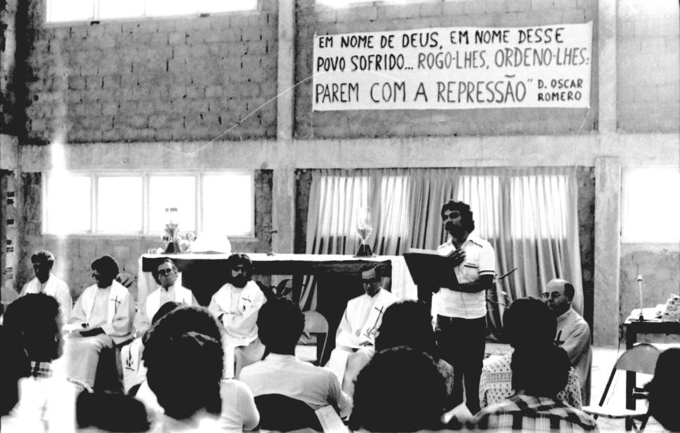 Missa celebrada por vários padres da PUC-Rio em homenagem à Dom Oscar Romero (arcebispo de San Salvador assassinado), ao padre jesuíta Luis Espinal (assassinado na Bolívia) e ao sub-diácono Júlio César (agente de pastoral da Diocese de Valença/RJ, vítima de espancamento).