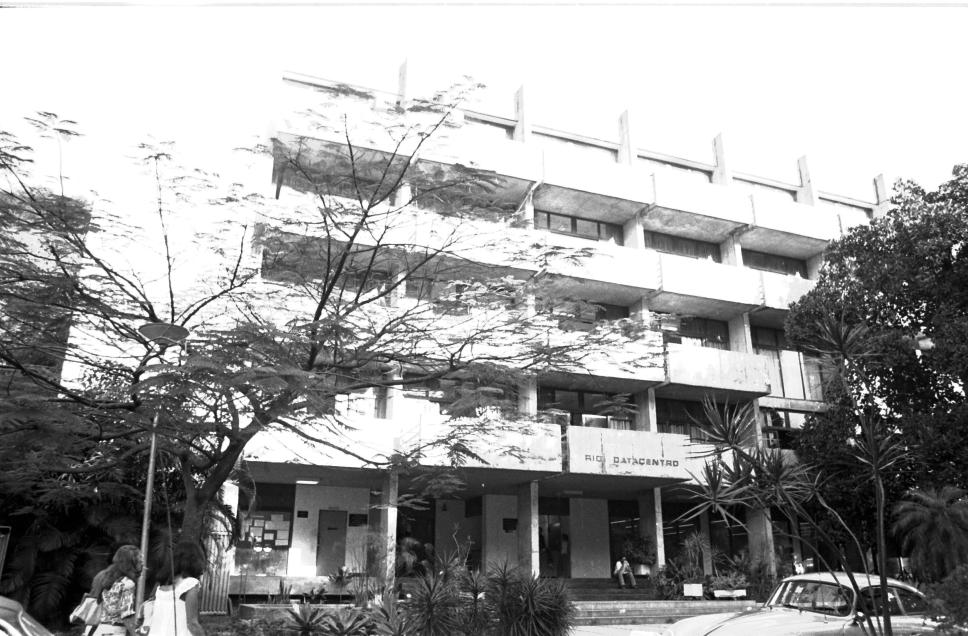 Fachada do prédio do Rio Datacentro, em frente carros estacionados e movimentação de estudantes e funcionários.