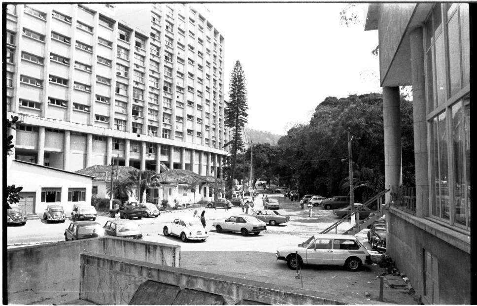 Vista da entrada do campus. À direita, a Ala Frings e à esquerda, o Edifício Cardeal Leme. 1980.