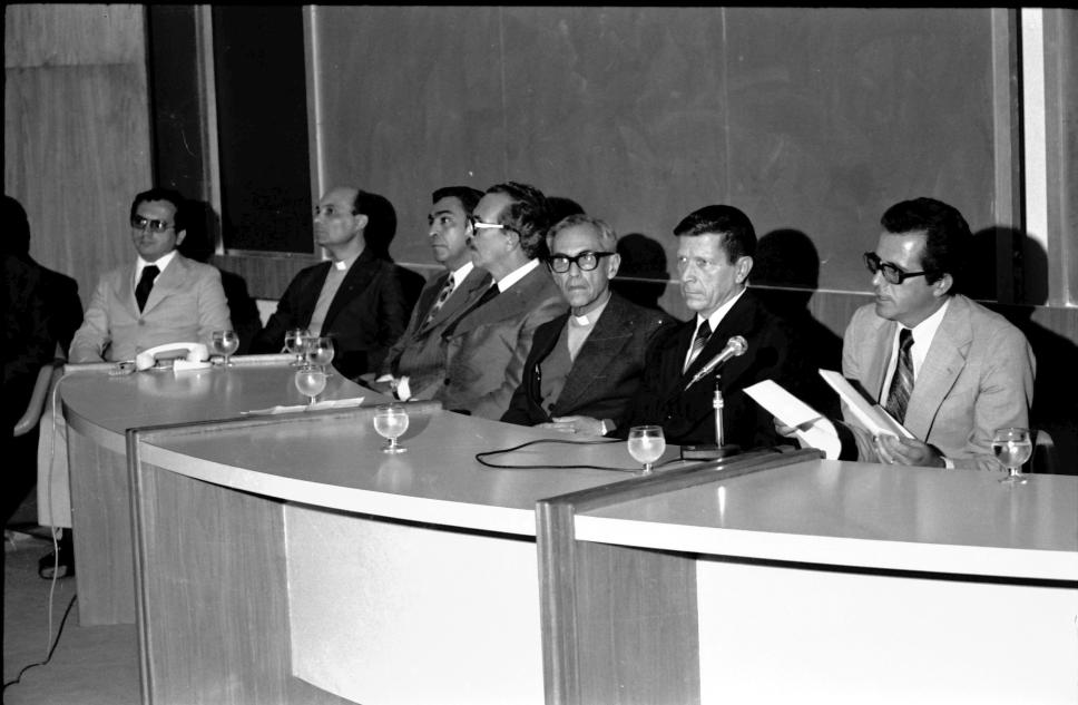 prof. Augusto Luiz Duarte Lopes Sampaio (COM), pe. João Augusto Anchieta Amazonas Mac Dowell, S.J., n.i., n.i., pe. Pedro Belisário Velloso Rebello, S.J., ministro das Comunicações Euclides Quandt de Oliveira, Mauro Soars de Assis