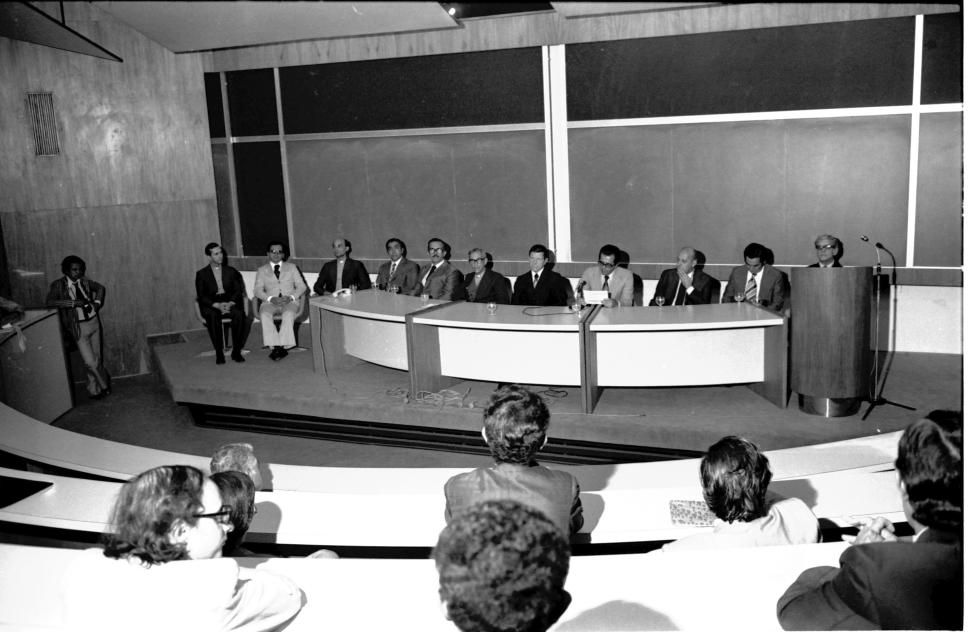 pe. José de Souza Mendes, S.J., prof. Augusto Luiz Duarte Lopes Sampaio (COM), pe. João Augusto Anchieta Amazonas Mac Dowell, S.J., n.i., n.i., pe. Pedro Belisário Velloso Rebello, S.J., ministro das Comunicações Euclides Quandt de Oliveira, Mauro Soares de Assis