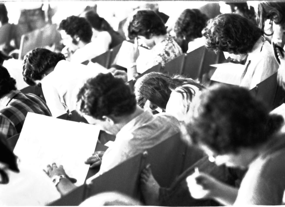 Alunos na arquibancada por ocasião da prova de vestibular.