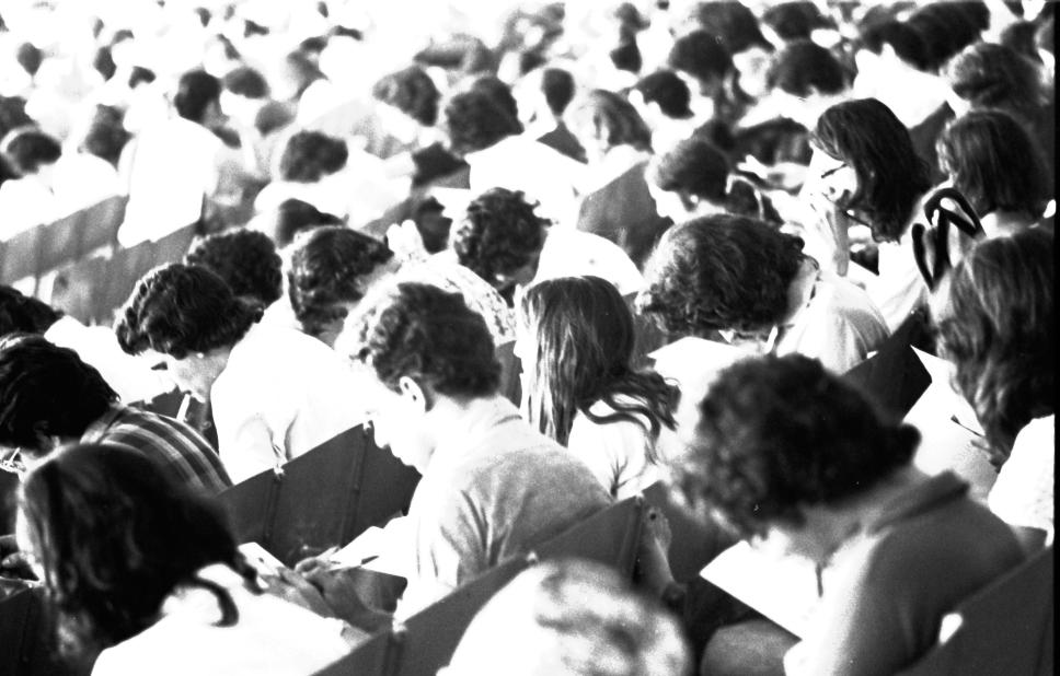 Alunos na arquibancada por ocasião da prova de vestibular.
