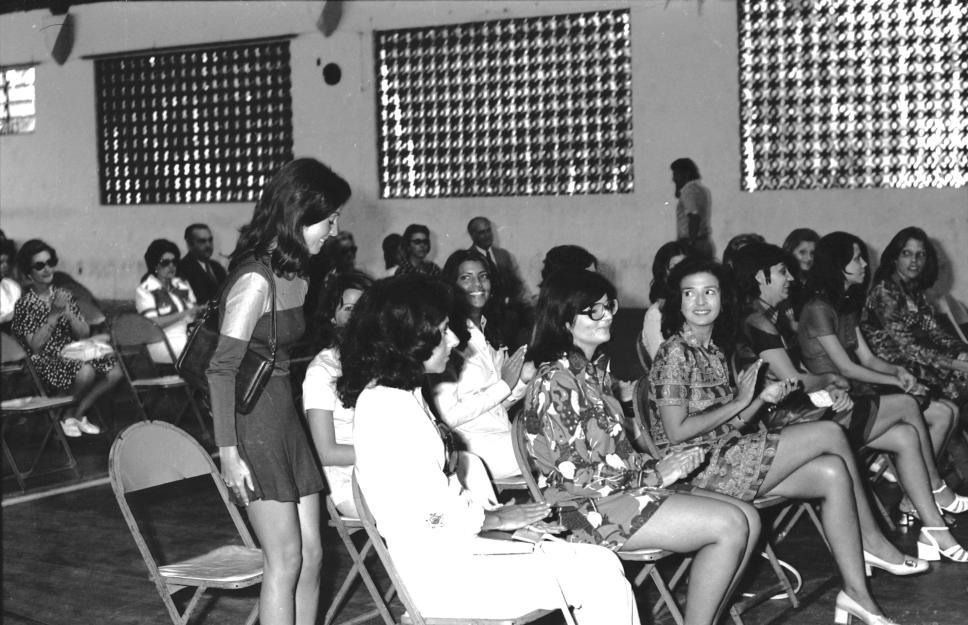 Alunas formandas, familiares e convidados durante cerimônia de formatura do Departamento de Letras, realizada no antigo ginásio da PUC-Rio. 1973.